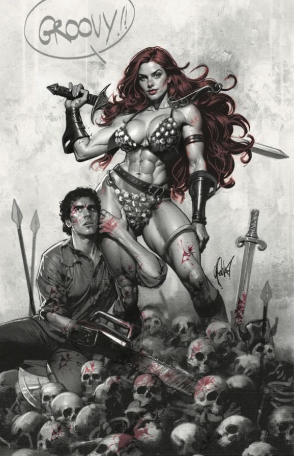An all-new mini-series featuring everyone's favorite, Deadite-slaying, bumbling hero - Ashley J. Williams - as he sends himself (once again) back in time, to the wrong time, only this time, THIS TIME he faces Red Sonja - She-Devil with a Sword! And lurking in the shadows? Kulan Gath himself... and if the most dread Wizard of the Hyborian Age gets his hands on the Necronomicon? Well, sh*t, that ain't gonna be good!