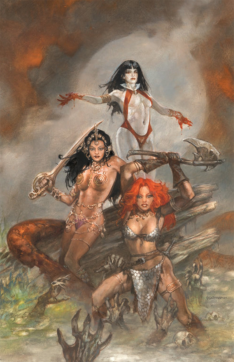 As a special bonus, this 40-page one-shot also includes a reprint of KURT BUSIEK and BENJAMIN DEWEY's "Seeing Red" from the pages of Red Sonja: Black, White, Red, which finds the She-Devil with a Sword seeking a precious, priceless item in the foreboding Mountains of Night!